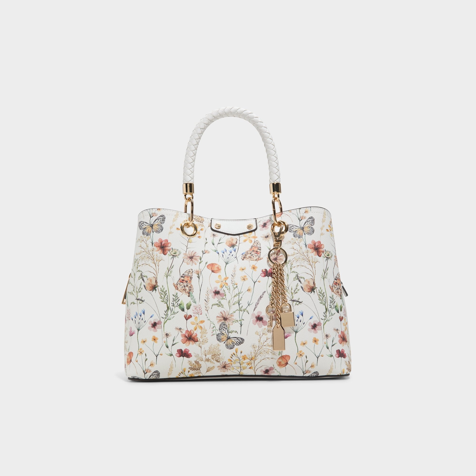 Wildflower illustrations crown this structured tote. where woven handles meet gleaming gold key-fob accents for a visually dominant accent that shifts everyday practicality into a statement piece you carry with ease. Carry it with a pastel suit for office coffee runs. or sling it over a sundress for weekend market strolls. letting the floral print finish the look.