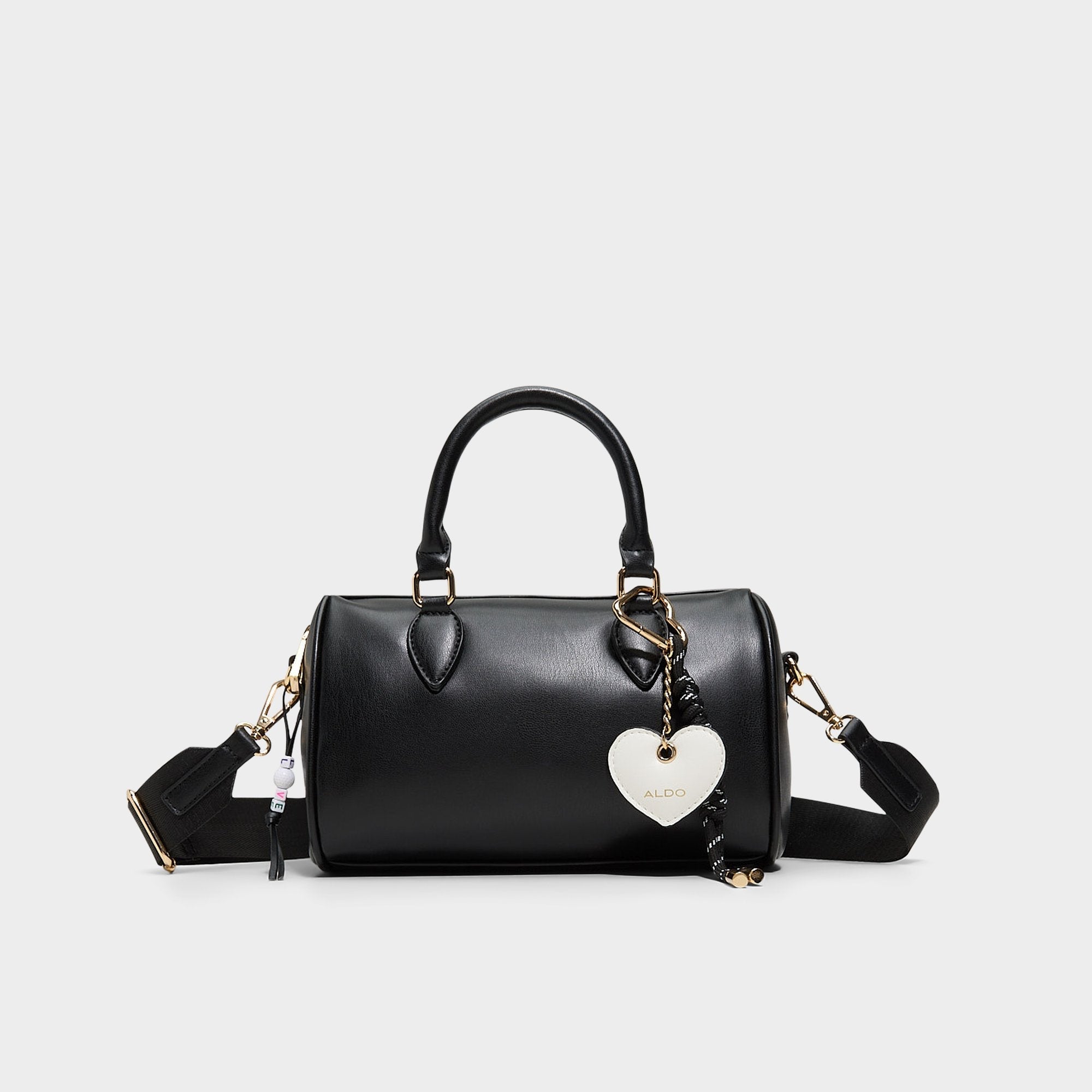 Black barrel bag with a convenient top handle and removable heart-shaped ornament. The perfect romantic accessory for Valentine's Day plans—timeless style meets festive charm in one versatile piece.