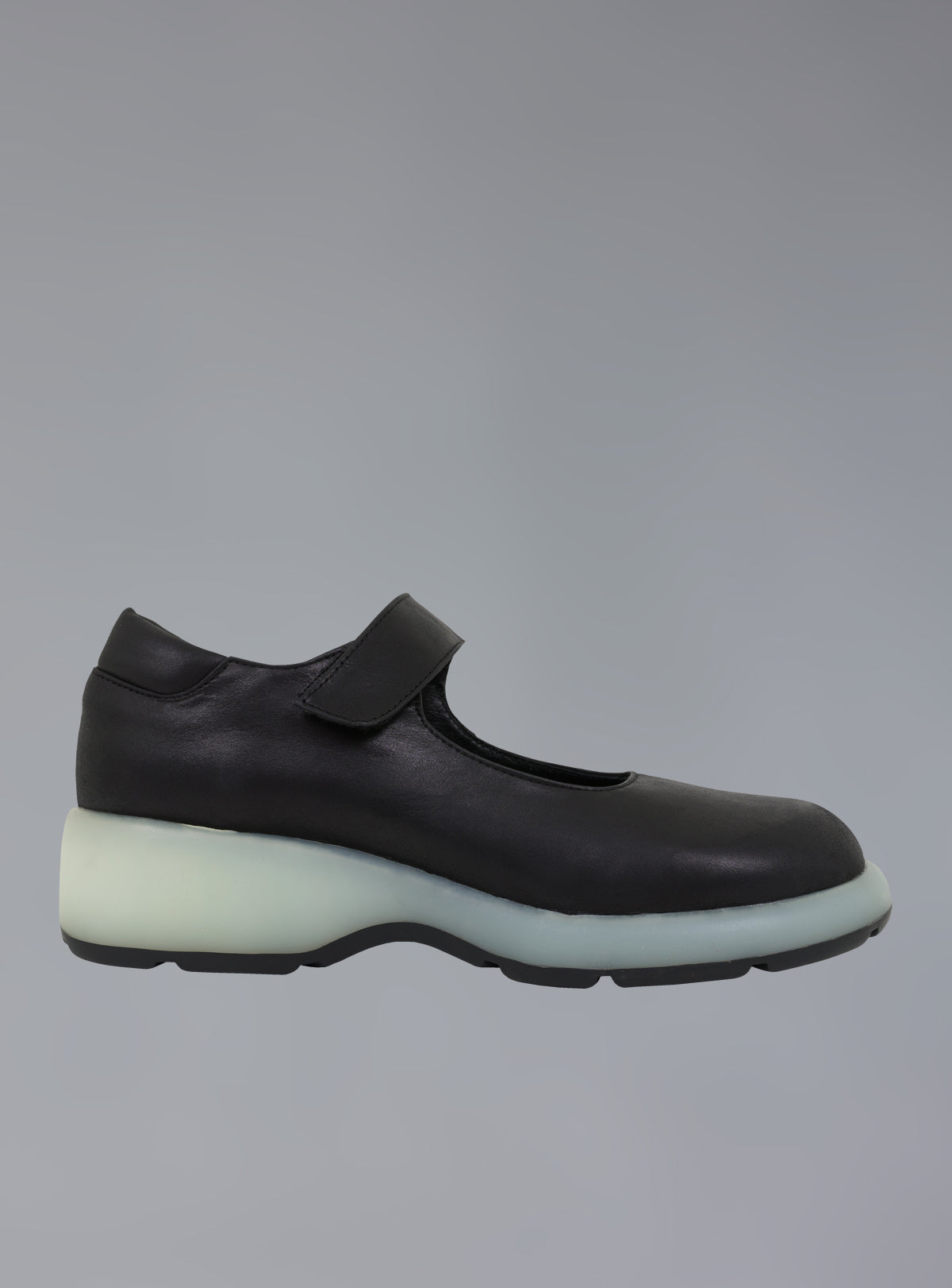The Volta Mary Jane features a clear. solid rubber sole and an adjustable velcro strap. Super versatile and comfortable! Fit is true to size.